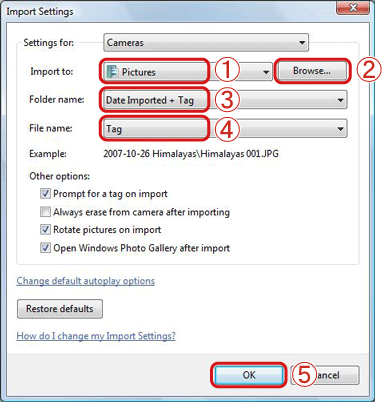 If you want to create folders in [Pictures] or [My Pictures] by the dates that the images are imported, leave the default settings as they are, or make the setting like the ones shown on this screen.