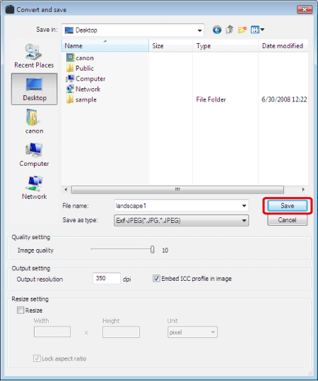 3. The [Convert and save] window appears. Specify a file name, a location to save the image, and the image type, and then click [Save].