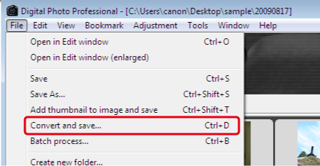 To view, edit and print a RAW image with software other than Digital Photo Professional, convert to a more versatile JPEG or TIFF image and save. The image is saved as a separate image, so the RAW image remains unaffected.