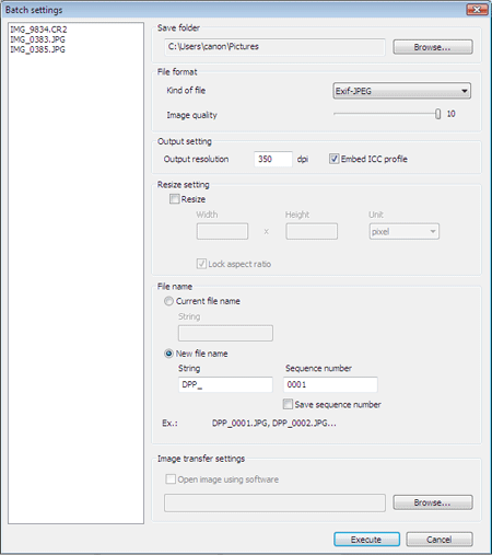 3. The [Batch settings] window appears. Specify the required settings, and then click the [Execute].