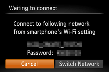 5. In the smartphone’s Wi-Fi setting menu, choose the SSID (network name) displayed on the camera to establish a connection. In the password field, enter the password displayed on the camera.