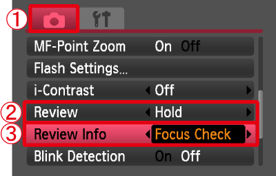 Operate the ⋖directional buttons⋗ to set [Review Info] to [Focus Check].