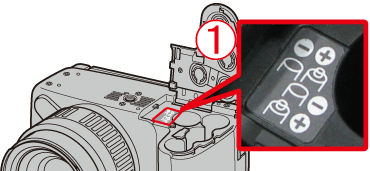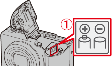 By referring to the battery illustration shown inside the [Memory Card / Battery Cover] (or [Battery Cover]), insert the batteries properly.