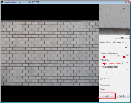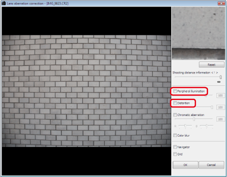 4. When the [Lens aberration correction] window appears, select the items to be corrected. This section describes how to correct [Peripheral Illumination] and [Distortion].