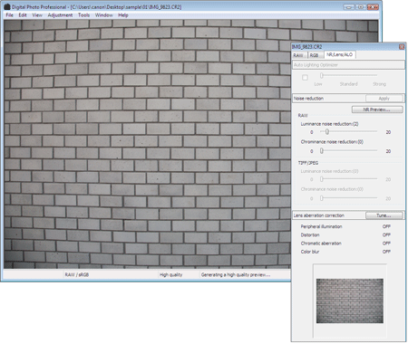 About "Compatible Cameras" and "Compatible Lenses", please refer to Compatible Cameras and Lenses for the Function of Correcting Lens Aberration with Digital Photo Professional 3.8.