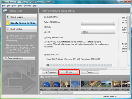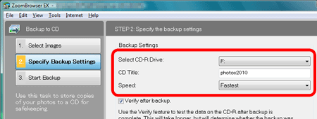 After selecting the images to save to the CD-R/RW disc, click [Specify Backup Settings].