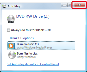 1. Place a CD-R/RW disc in the CD-R/RW drive. If a window like the one below appears, click [ ] or [Cancel] to close this screen.