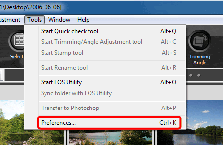 1. Start Digital Photo Professional and select [Preferences] from the [Tool] menu.