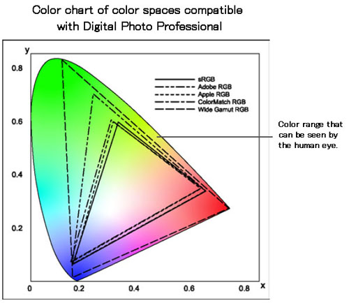 The color space is a reproductive color range. For digital cameras, there are color spaces called sRGB, which is widely used, and Adobe RGB, which can express green and blue ranges vividly. Digital Photo Professional supports five kinds of color space, and you can set the color space that makes the best use of the image's characteristics as necessary.