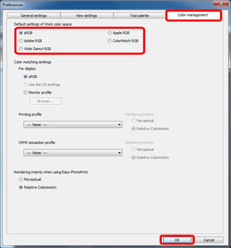 Select the [Color management] tag to select the color space of your choice, and then click [OK].