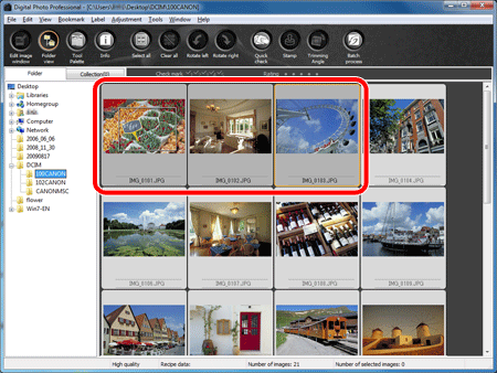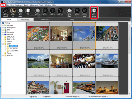 | Batch process | Convert in batches adjusted multiple RAW images to JPEG or TIFF images and save. The original RAW images remain unaffected. |