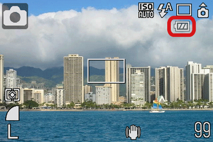 Turn on the camera, and the battery icon will appear on the LCD monitor*. If the icon does not appear, press the ⋖DISP.⋗ () button several times.