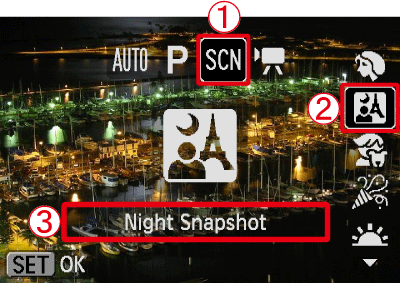 [Night Snapshot] () is the mode to shoot the subject and the background nightscape clearly. This section describes how to set [Shooting Mode] to [Night Snapshot] (