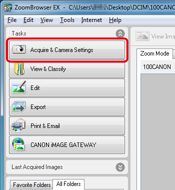 2. Once ZoomBrowser EX is running, click [Acquire & Camera Setting].