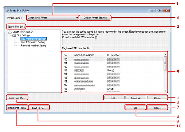 Speed Dial Utility is a utility for forwarding the fax/telephone numbers registered on the machine to a computer and registering/changing them on the computer. In addition, you can register the fax/telephone number, user's name, user's fax/telephone number, and rejected numbers edited on the computer to the machine. You can also save them on the computer as a backup.