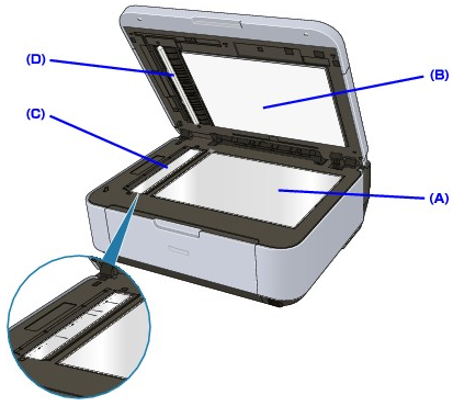 With a clean, soft, lint-free cloth, wipe the Platen Glass (A), the inner side of the Document Cover (white sheet) (B), the glass of the ADF (C), and the inner side of the ADF (white area) (D) gently. Be sure not to leave any residue, especially on the Platen Glass.