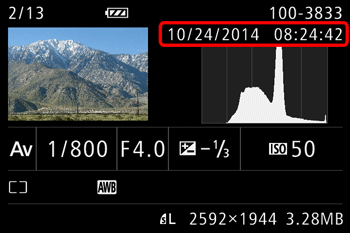 You can confirm the Shooting date and time by switching the display mode to Simple Information Display or Detailed Information Display.