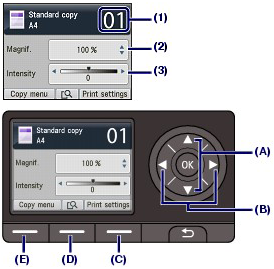 button (B) to select an option. After confirming or changing the settings, press the OK button to return to the copy standby screen.