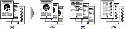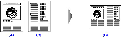 You can copy two original pages (A) (B) onto a single sheet of paper (C) by reducing each image.