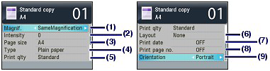 Press the right Function button to select Print settings on the copy standby screen. You can select the item, such as page size, media type, or print quality, and change the setting.