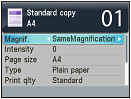 Specify the enlargement/reduction manner. You can specify the copy scale by selecting the page size: A4 to A5, A4 to B5, etc. If you do not want to enlarge/reduce the page size, select SameMagnification.