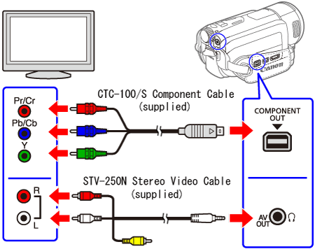Some TVs may not output video properly. In that case, please use the component cable and the stereo video cable to connect the camcorder to the TV.