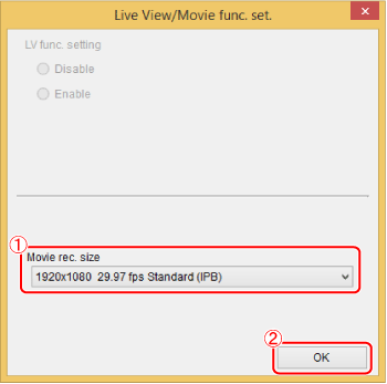7. The [Live View/Movie func. set.] window appears, so select the [Movie rec. size] from the list box ( ), and then click [OK] (