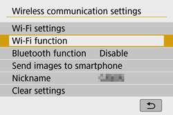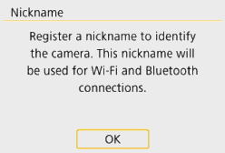 When the camera is connected to another device via a wireless LAN, the nickname will be displayed on the device. Be sure to set a nickname as otherwise you cannot go to the wireless LAN settings screen.
