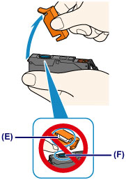 Do not touch the inside of the orange protective cap (E) or the open ink port (F). The ink may stain your hands if you touch them.