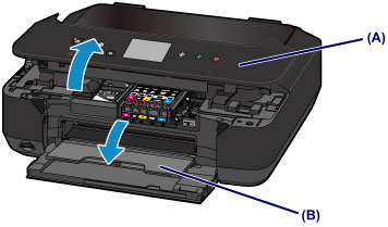 3. Open the operation panel (A), then open the paper output tray (B).