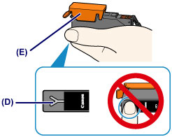 (2) Hold the ink tank with the orange protective cap (E) pointing up while being careful not to block the Y-shape air hole (D).