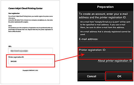 (3) Enter your e-mail address and printer registration ID, and select [ OK ].