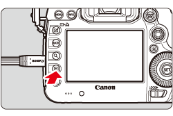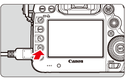Connect the stereo AV cable to the camera's ⋖A/V OUT / DIGITAL⋗ terminal. With the plug’s ⋖Canon⋗ logo facing the back of the camera, insert it into the ⋖A/V OUT / DIGITAL⋗ terminal.