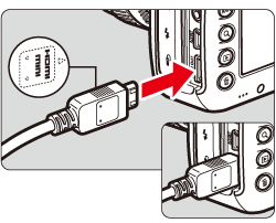 With the plug's ⋖ HDMI MINI⋗ logo facing the front of the camera, insert it into the ⋖HDMI OUT⋗ terminal.